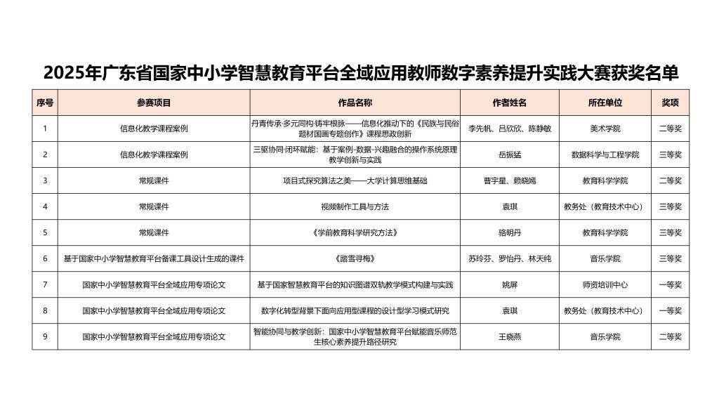 根據《關于2025年廣東省國家中小學智慧教育平臺全域應用教師數字素養提升實踐大賽獲獎名單及報送全國交流名單的公示》,我校教師在此次大賽中表現優異,共獲9項榮譽,其中一等獎2項、二等獎3項、三等獎4項,涵蓋課程案例、常規課件、專項論文等多個項目。本次大賽以“人工智能賦能高質量課堂”為主題,旨在全面落實國家教育數字化戰略行動,推動教師數字素養提升與教育教學創新。自2025年4月大賽啟動以來,我校高度重視,由教務...